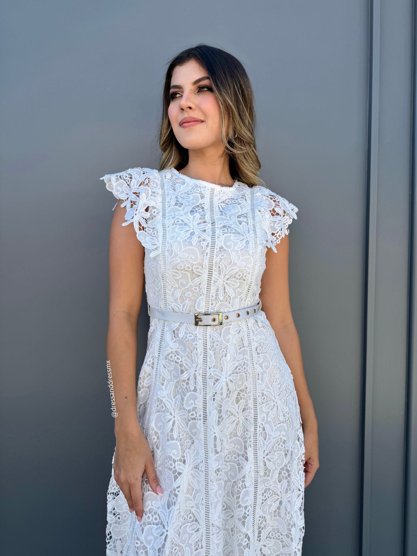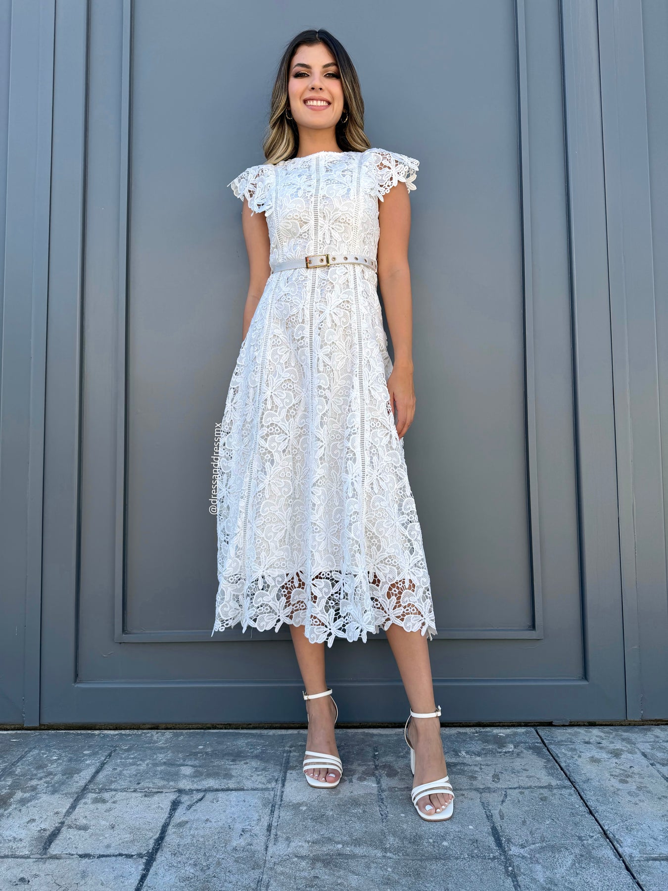 Vestido midi de encaje color ivory , detalle de cinto , cierre en espalda.