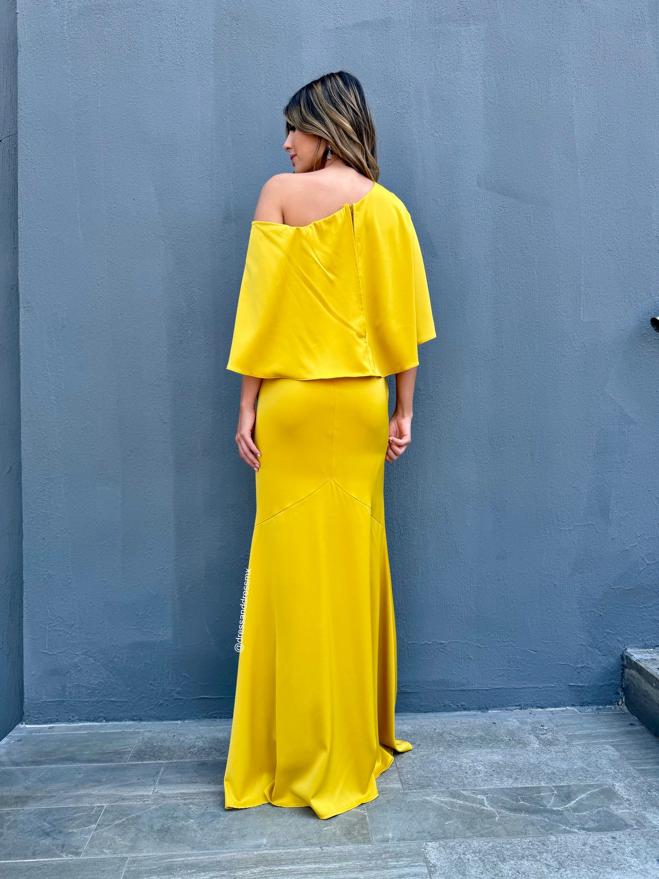 Vestido tela satin color amarillo , mangas tipo capota, cierre en espalda invisible.