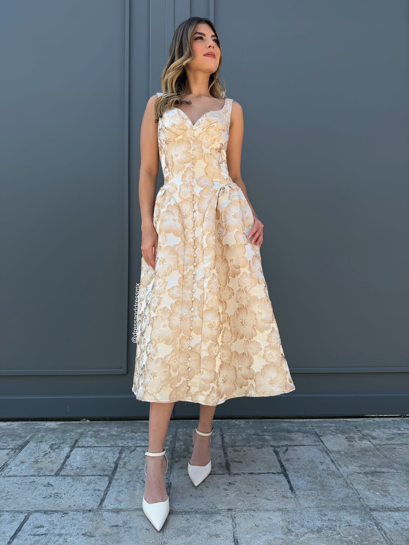 Vestido midi, línea A, detalle de estampado en dorado y botones decorativos, bolsillos laterales, cierre invisible en espalda .