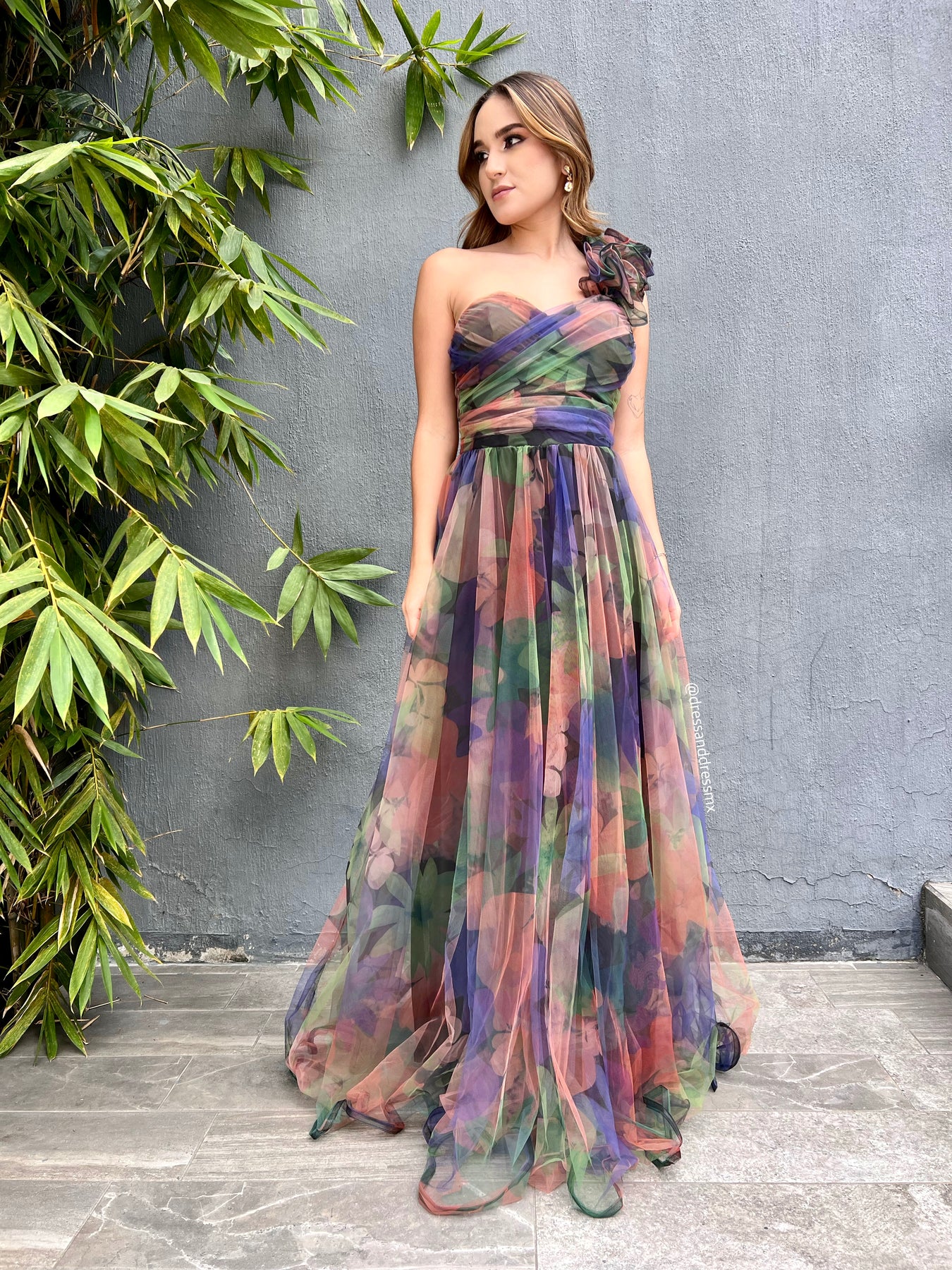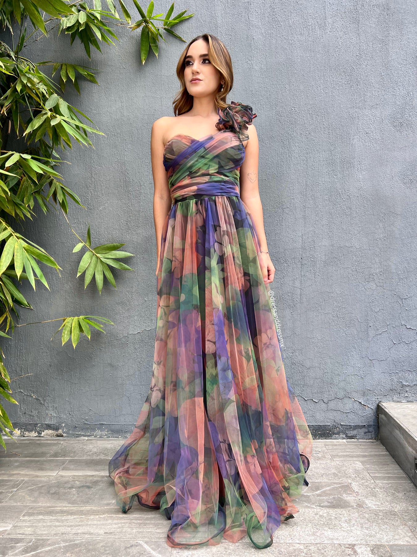 Vestido de tul suave, detalle de Olanes en un tirante, jareta ajustable en espalda. Estampado terracota, azul, verde.