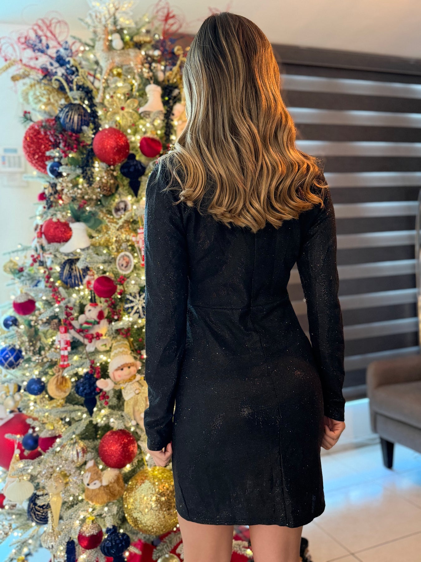 Vestido negro drapeado en cintura, cierre invisible en espalda.