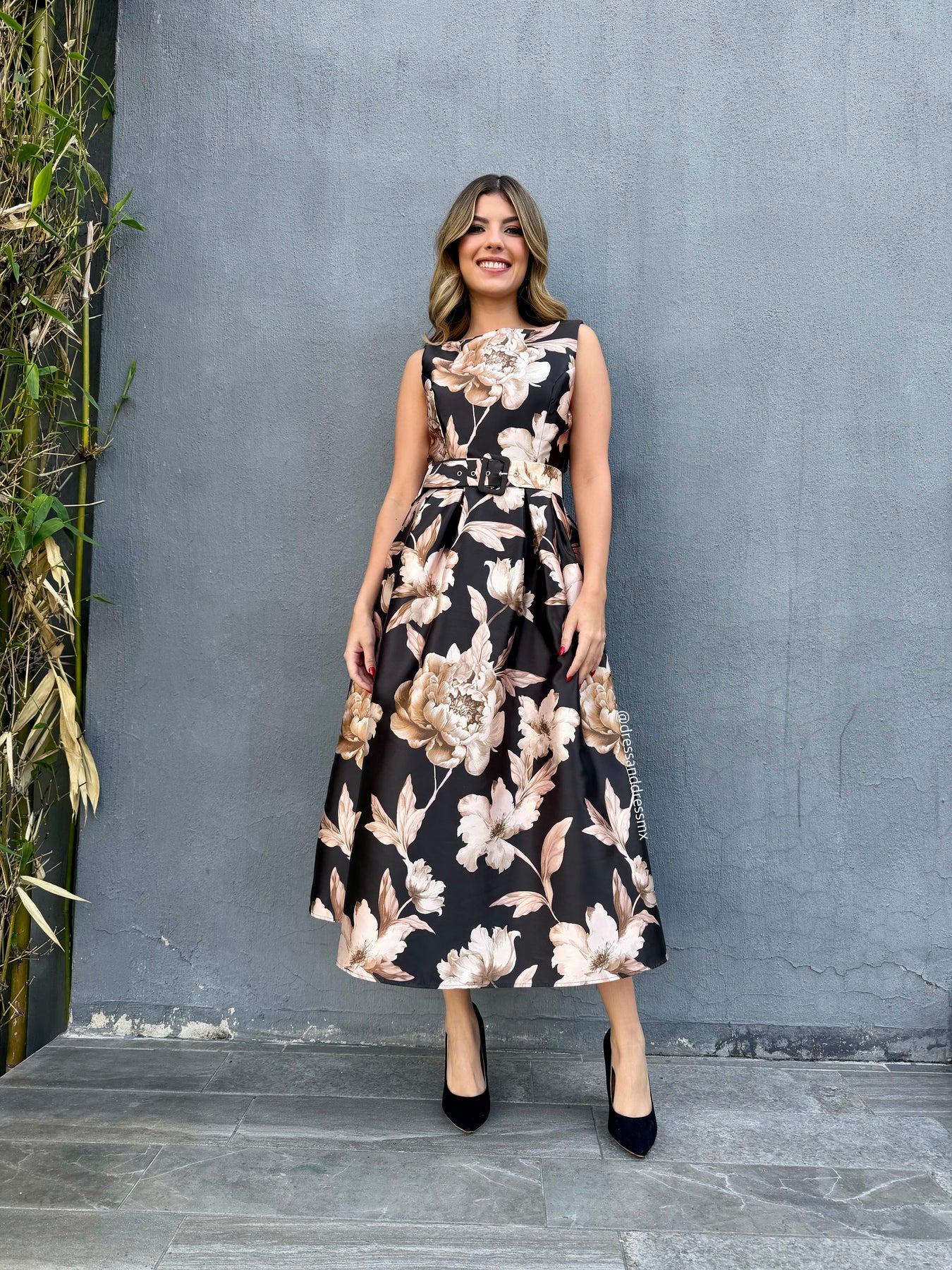 Vestido midi detalle de flores color bronce , cinto ajustable.
