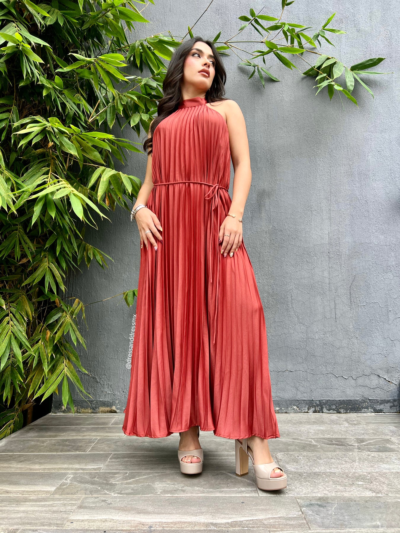 Vestido midi tableado, halter, ajustable en cintura, color terracota/ladrillo .