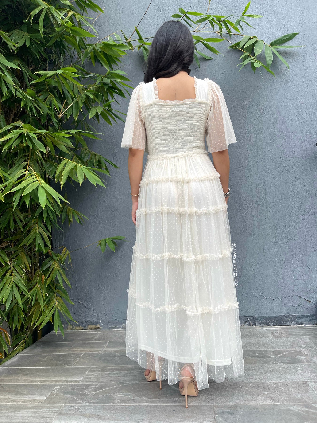 Vestido tela tipo tul con estampado de puntos, elástico en busto, manga caída, estira, color crema.