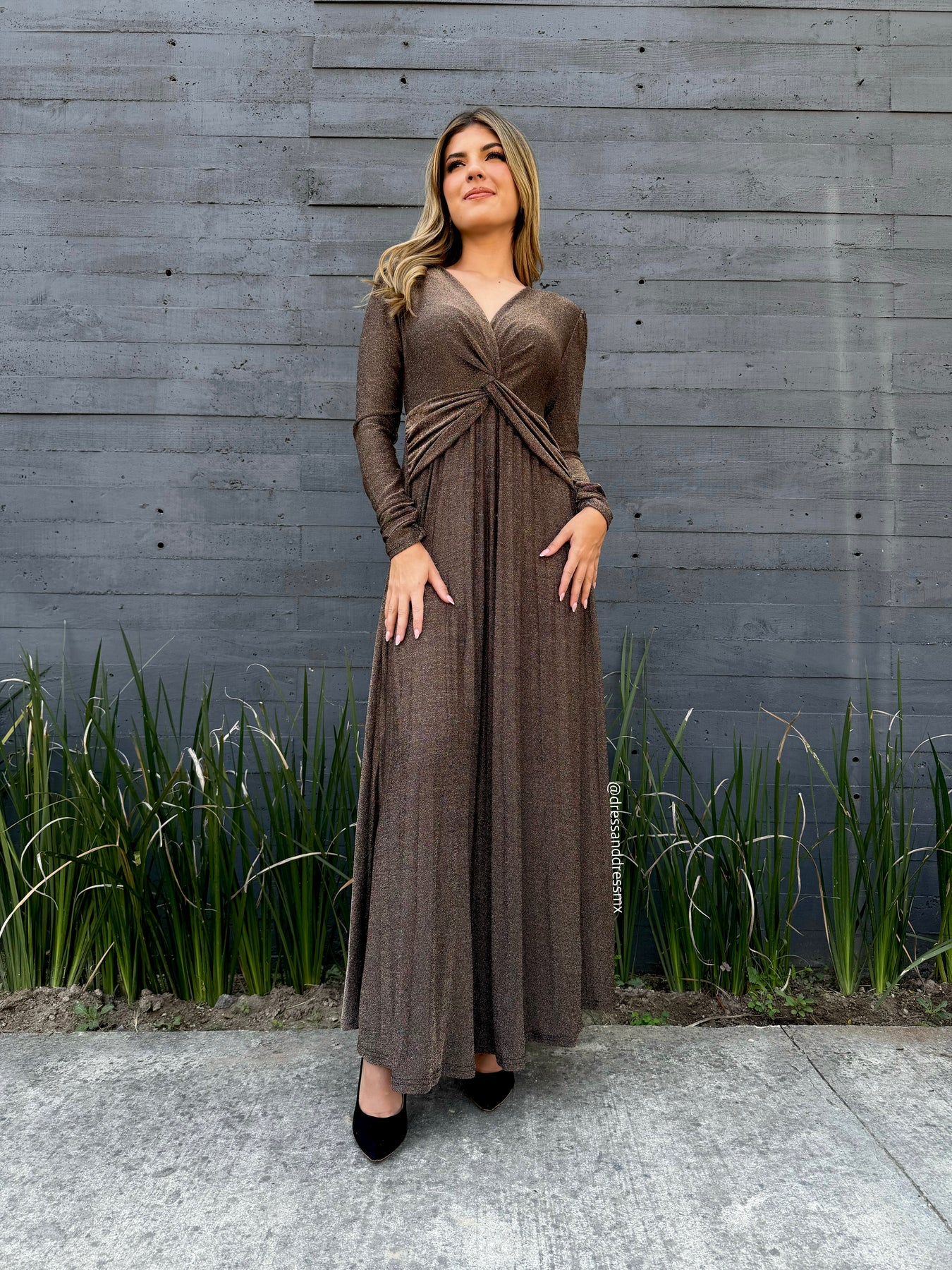 Vestido tela strech color cobre brilloso, drapeado en busto, manga larga, corte al tobillo.