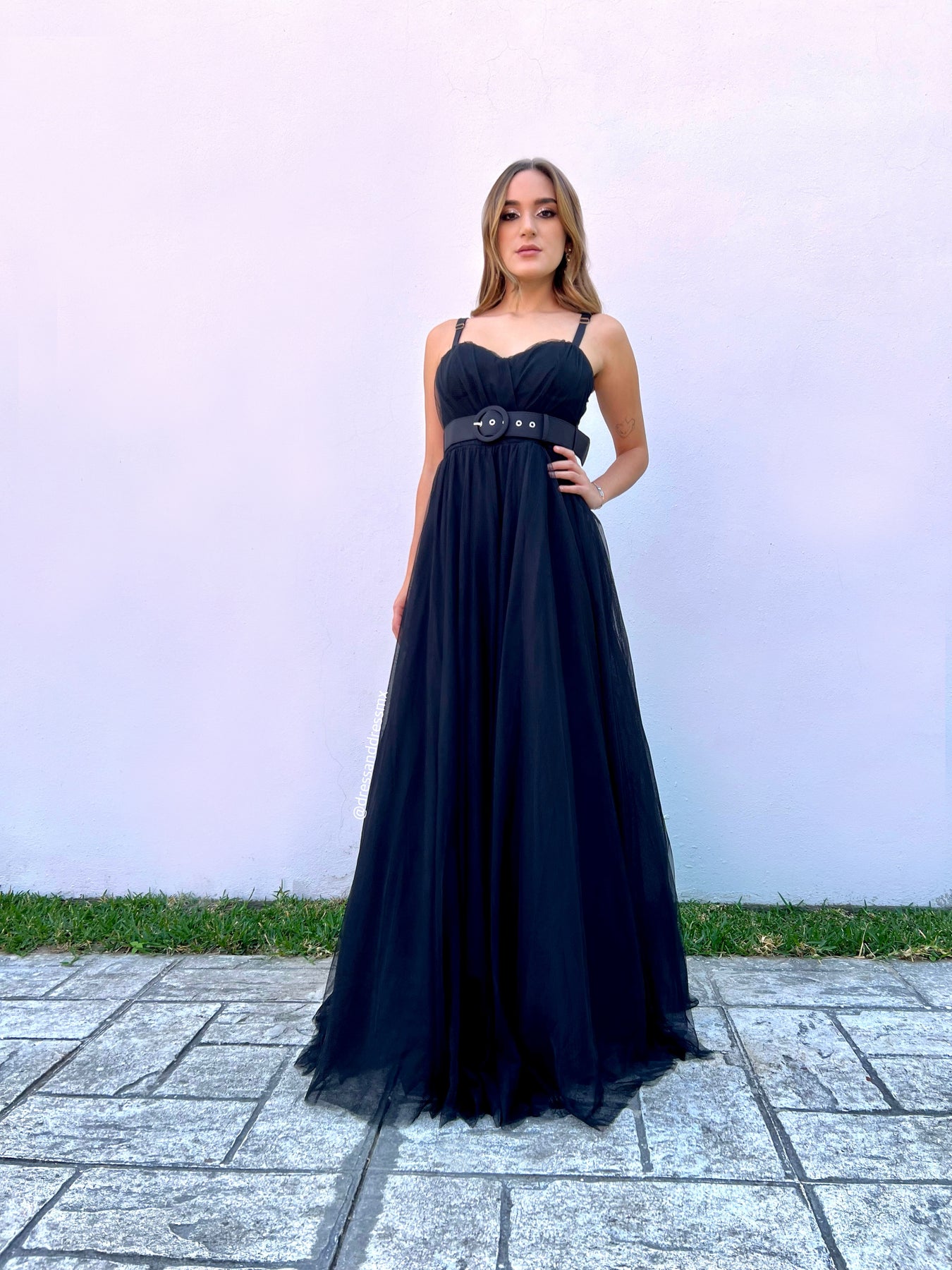 Vestido línea A color negro, tela tul delgado, cinto ajustable en cintura, tirantes ajustables.