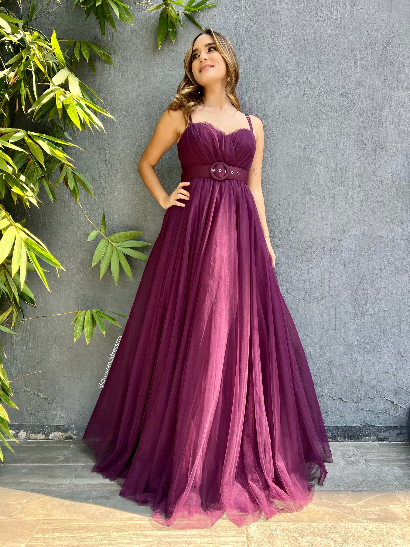 Vestido línea A color vino, tela tul delgado, cinto ajustable en cintura, tirantes ajustables.
